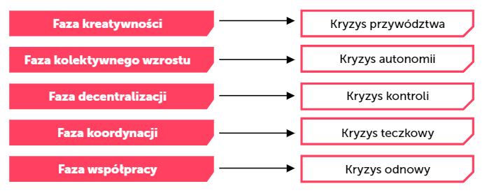 Model cykli życiowych organizacji według Greinera. Na podstawie Mary Jo Hatch, „Teoria organizacji”, PWN, Warszawa 2002, s. 179.